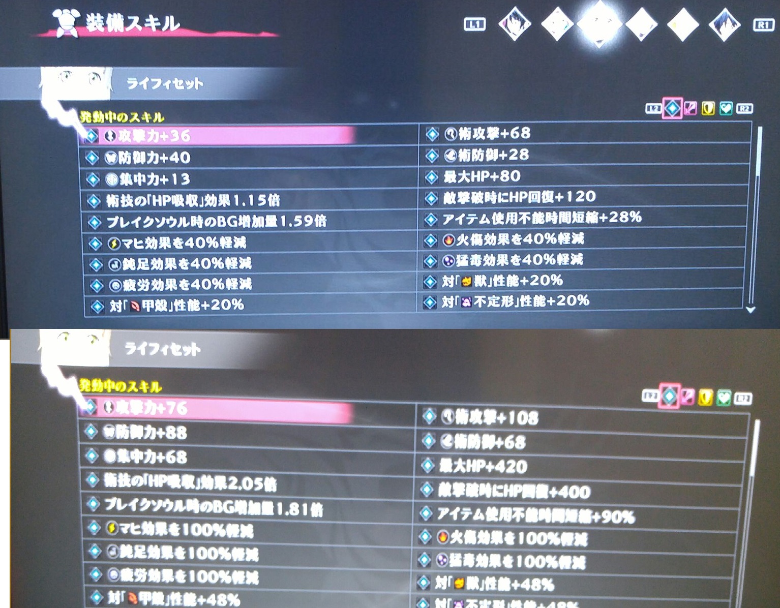 おそらくアドレスは並び的にCDB0以降からかな? 途中の装備品だったので、ちょっとわからないのですが自分は"7F"という区切りがありました。 一応予測の域を出ませんが・・・ 以降アドバンス上 7F の後 00 aa aa aa 00 00 00 bb 00 00 00 cc 00 00 dd dd 00 00 00 ee 00 00 ff ff 00 gg 00 hh 00 ii 00 jj 00 kk 00 mm 00 nn 00 pp 00 qq 00 rr 00 ss 00 tt aa aa aa bb:ここに種類とか、何か含まれてるものかと。 cc:一つ目のパラメータ種類 0D:攻撃 0E:防御 0F:術攻 10:術防 11:集中 dd dd:1つめのパラメータ ee:一つ目のパラメータ種類 0D:攻撃 0E:防御 0F:術攻 10:術防 11:集中 ff ff:1つめのパラメータ ここからは超予測 gg:マスタースキル種類 hh:マスタースキルランク ii:強化ボーナス2種類 jj:強化ボーナス2ランク kk;ランダム1種類 mm:ランダム1ランク nn:ランダム2種類 pp:ランダム2ランク qq:ランダム3種類 rr:ランダム3ランク ss:強化の数字(MAXが0A 10回)コレは」確認済み。 tt:??。 検証中 スキルの種類・効果の欄はOKだと思う。 強化は0A(強化+10)にいきなりしちゃうよりは+9にして1回改造がベスト(攻撃力などの数値は変わらず。) パラメータは999にすることはできたが強化により規定値に戻る模様。 スキルの種類は、これからちょっとずつ埋めていこうと思います。 9/24 01:45 スキルリスト(未完)を添付へ。自分のデータの中のスキルです。眼がショボショボ・・・。